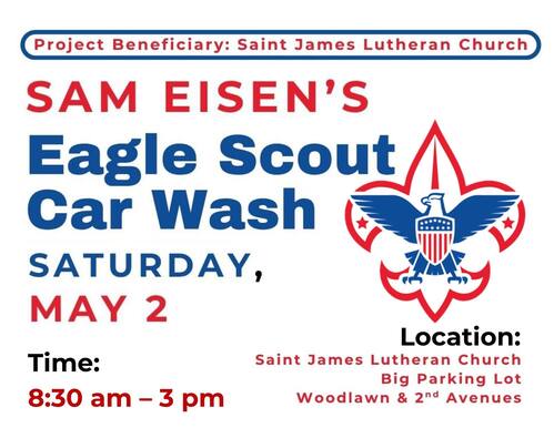 Our very own Sam Eisen is fundraising for his Eagle project right here at St James Lutheran Church. Please join us Saturday, May 2nd from 8:30am – 3pm in the big parking lot. “My project includes a new St James Lutheran Church exterior sign facing Woodlawn Ave. with low-maintenance plantings, and a newly constructed storage box for our Lemonade on the Lawn, along with street barricade storage.” Pre-Sale Car Wash tickets are available for purchase after the 10 am service. Your support is greatly appreciated. Cost per vehicle is $20. “Thank you for helping me fund my Eagle Scout Service Project which will benefit our Church. Hope to see you all there.”